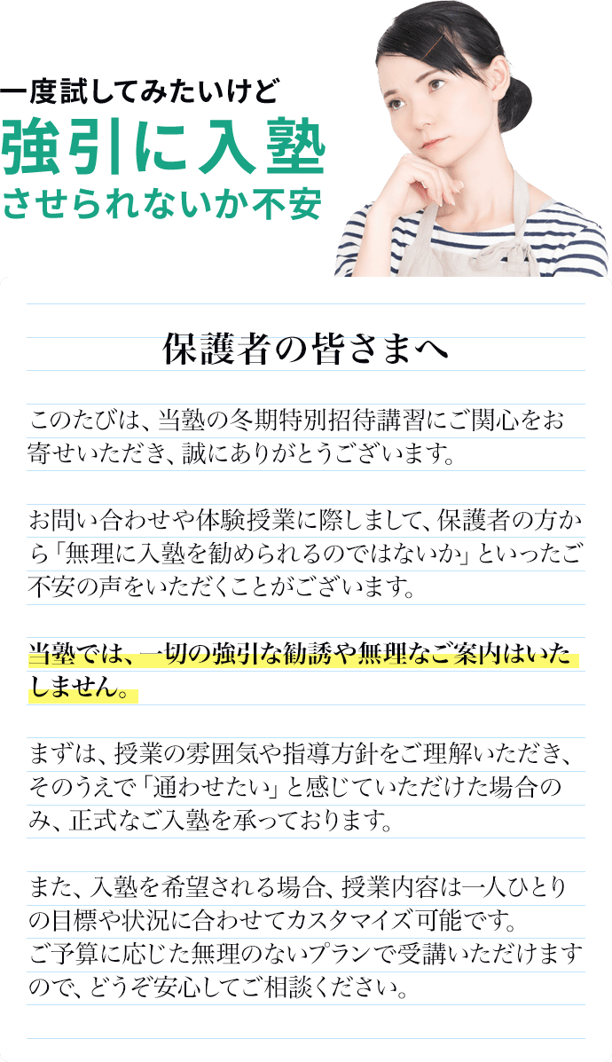 全くそんなことはありません。招待講習の状況や学力診断の結果を踏まえて、具体的な学習プログラムのご提案をさせていただくことはありますが、入会に関する無理な勧誘は一切ありません。